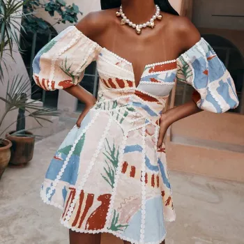 Elegant V-Neck Mini Dress with Lantern Sleeves and Lace-Up Back